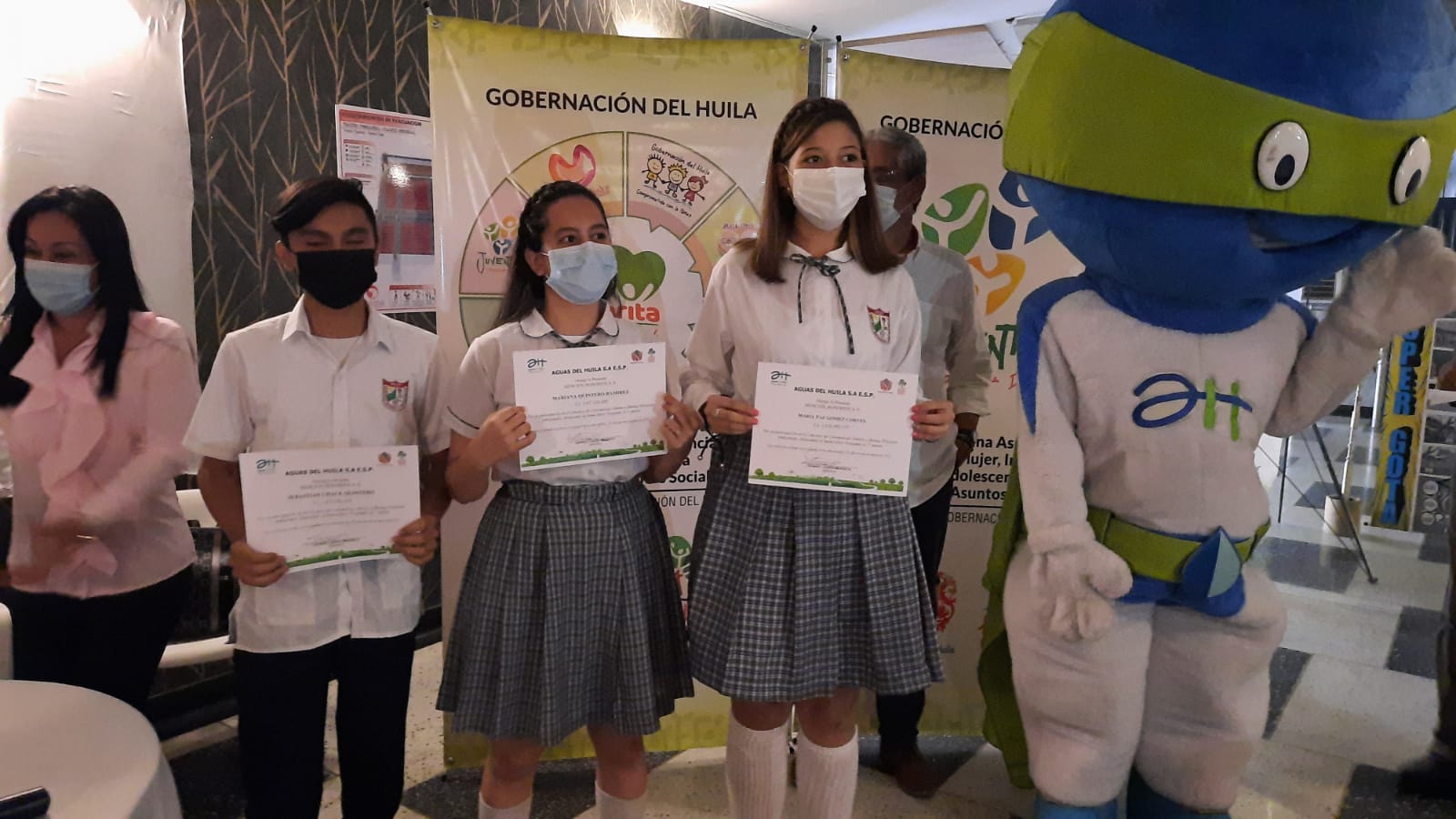 En presencia de los estudiantes ganadores, empresas patrocinadoras, familiares, Instituciones Educativas y mandatarios locales, fueron entregados los premios a las 6 propuestas ganadoras en las categor?as c?mic y cortometraje de ?ste concurso liderado por Aguas del Huila en articulaci?n con la Oficina de la Mujer, Infancia, Juventud y Asuntos sociales de la Gobernaci?n.